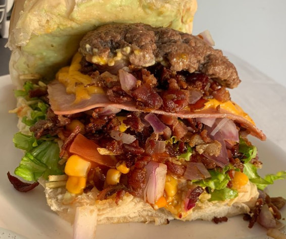 PAO, MAIONESE DA CASA, CATCHUP, MOSTARDA, ALFACE, TOMATE, BATATA PALHA, MILHO, CEBOLA ROXA, HAMBURGUER CASEIRO 150G, BACON, PRESUNTO E QUEIJO PRATO.